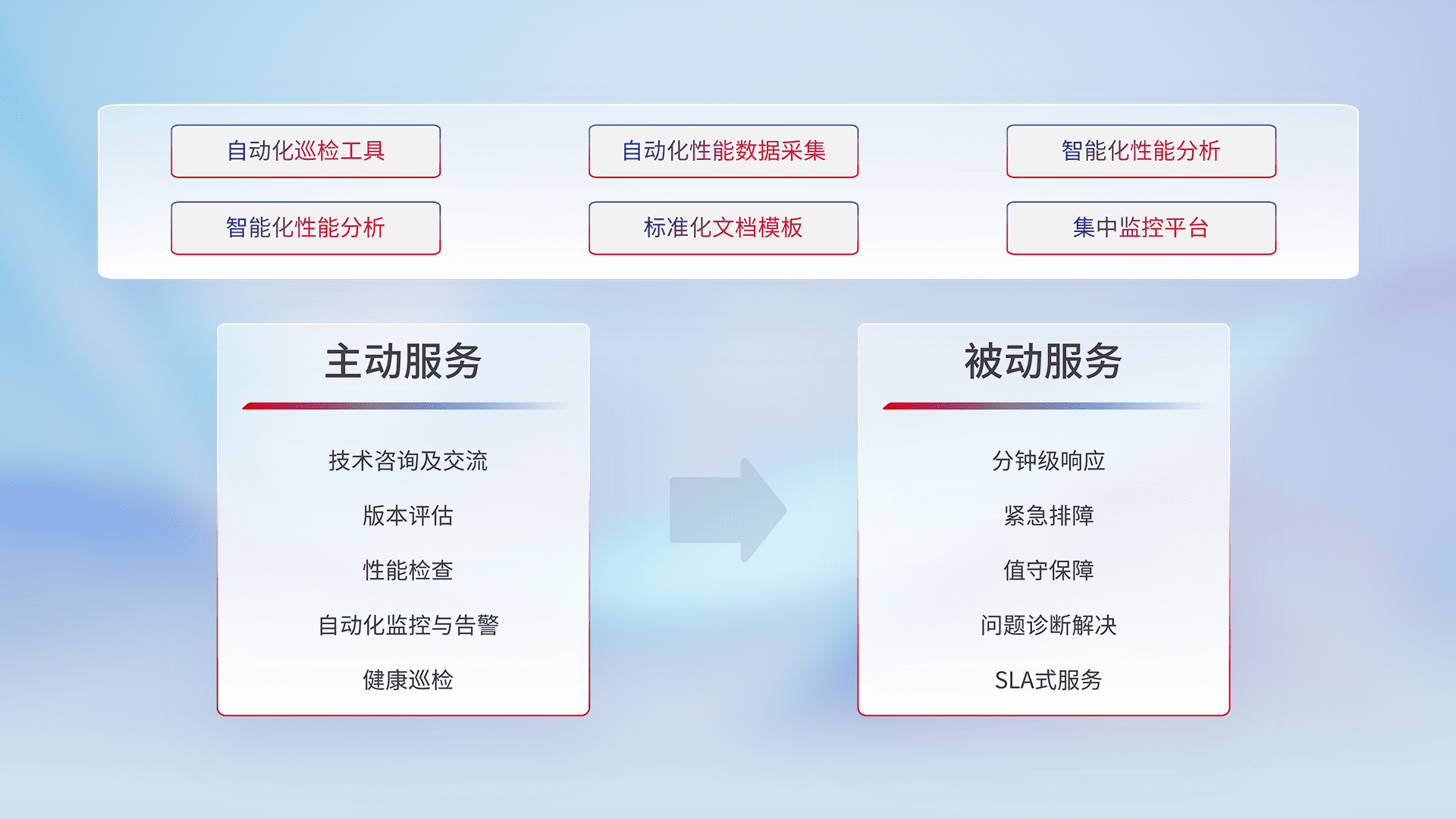 智能化工具和标准化文档,,保障服务质量,,,提供主动服务(包含技术咨询、、、、版本评估、、、、性能检查、、、自动化监控与告警、、、健康巡检)和被动服务包含(分钟级响应、、、、紧急排障、、值守保障、、、问题诊断解决、、SLA服务)。。。